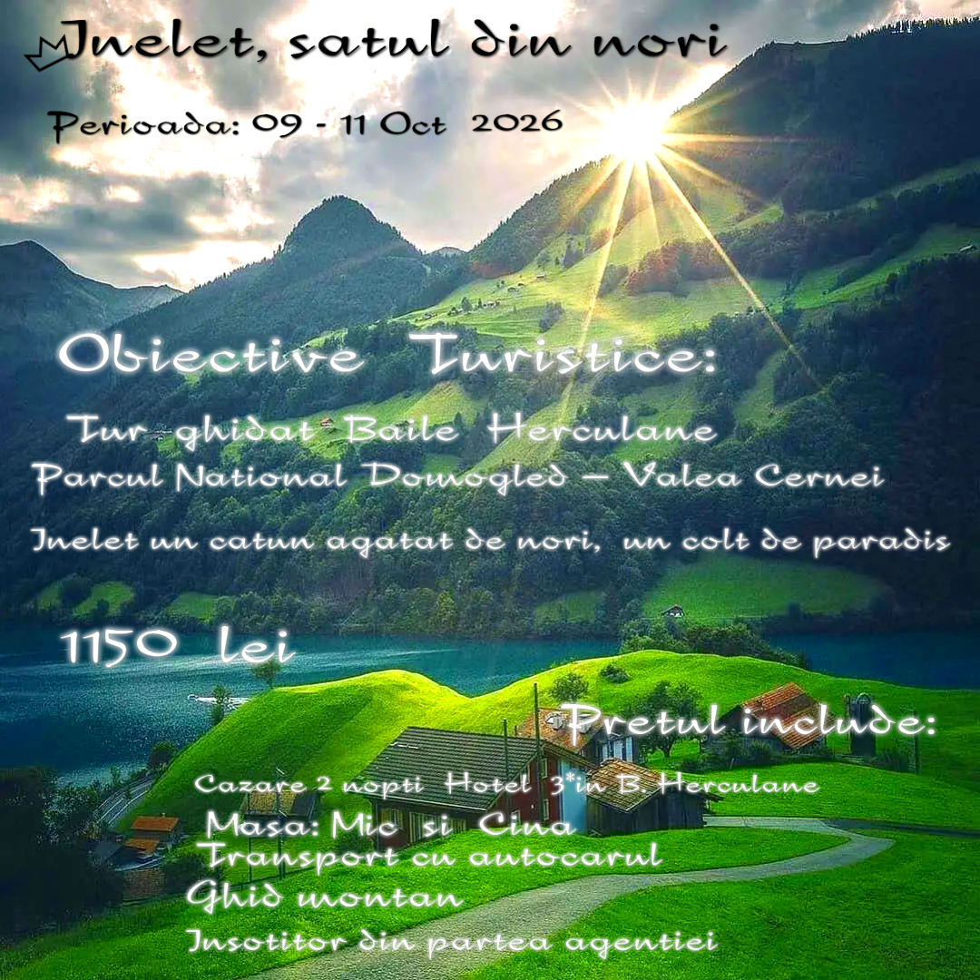 Cash/Card ( la sediul nostru pe Str.Siderurgistilor , nr .2-Ultimul Leu . Prin Ordin de plata sau depunere la Banca ING Galati in contul nostru in RON: RO20INGB0000999906636030pentru ACAOMIC SRL cu mentiunea “INELET , SATUL DIN NORI “ Diferenta de plata se va achita cu minim 30 zile inainte de inceperea excursiei. NU SE FAC PLATI “LA AUTOCAR” ! Neachitarea integrala a excursiei cu 30 zile inainte de inceperea acesteia se va considera RENUNTARE si locul va fi eliberat. Conditii de retragere/anulare/modificare 100% daca anularea se face cu mai putin de 30 zile inainte de inceperea excursiei 50% daca anularea se face cu mai putin de 45 zile inainte de inceperea excursiei 30% daca anularea se face cu mai putin de 60 zile inainte de inceperea excursiei Este permisa schimbarea numelui fara nici o plata suplimentara cu minim 7 zile inainte de inceperea excursiei. Pentru anulari in cazuri deosebite, urgente medicale etc va recomandam sa incheiati o polita de asigurare storno in agentie sau online. Conditii generale Transportul este asigurat cu microbuz/autocar clasificat, destinat transportului de turiști în trafic intern și internațional Avansul nu este rambursabil in cazul renuntarii la pachetul turistic. In cazul nerealizarii grupului minim programul turistic poate fi anulat sau modificat, turistii avand posibilitatea de a alege participarea la programul initial sau mutarea pe un alt program turistic. Turistii pot solicita restituirea integrala a contravalorii pachetului turistic in cazul in care acesta este anulat. Cazarea se efectueaza in camere duble (matrimoniale sau twin) conform tarifului standard sau in camere single pentru turistii care au solicitat acest serviciu si pentru care au achitat supliment conform celor mentionate in oferta/contract. La solicitarea turistilor, acestia pot fi cazati in camere triple, camere duble cu pat suplimentar sau apartamente, in functie de disponibilitatea unitatilor de cazare. Unitatile de cazare sunt clasificate conform standardelor pentru fiecare tara. Orice modificare si orice solicitare suplimentara fata de pachetul turistic mentionat si detaliat poate genera costuri suplimentare. Distributia camerelor se face de catre receptia unitatii de cazare. Unitatile de cazare vor fi mentionate cu 7 zile inaintea plecarii. Insotitorul de grup, dar si ghidul local, pot modifica ordinea de vizitare a obiectivelor turistice, precum si ordinea zilelor din programul turistic, dar fara a afecta structura programului. Pentru ghidaj in interiorul obiectivelor turistice, pe teritoriul Romaniei si in strainatate, turistii pot solicita serviciile ghizilor locali, ceea ce poate genera costuri suplimentare, in functie de fiecare tara sau oras. Tarifele pachetelor turistice nu includ urmatoarele: bilete de intrare la obiectivele turistice, taxe foto, taxe video, taxe ghizi locali sau ghidaj interior, taxe muzeograf, taxe de statiune, taxe hoteliere, taxe de oras, alte cheltuieli personale, mese, taxe de aeroport, suplimente camere single, suplimente apartamente. Acestea sunt incluse in pachetul turistic doar daca au fost mentionate la “tariful include”. Intrarile la obiectivele turistice se achita in moneda locala sau in euro, acestea pot suferi modificari in functie de sezon si de autoritatile locale sub incidenta carora se afla in administrare. Agentia de turism nu este raspunzatoare de modificari la urmatoarele: taxe de intrare la obiectivele turistice, taxe foto, taxe video, taxe ghizi locali, taxe muzeograf, taxe hoteliere, taxe de statiune, taxe de oras, programul obiectivelor turistice schimbat in urma unor evenimente care se desfasoara in cadrul acestora. In cazul pachetelor turistice cu transport avion, orarul de zbor poate suferi modificari. Agentia de turism nu este raspunzatoare de anularea zborurilor, nici de modificarile orarelor de zbor, dar va veni in sprijinul turistului pentru cea mai buna varianta de rerutare (re-route) conform politicilor companiilor aeriene si reglementarilor in vigoare. Biletele de avion NU sunt transmisibile si nici rambursabile. Documente necesare calatoriei in afara Romaniei: pasaport valabil cel putin 6 luni de la data plecarii sau carte de identitate valabila. Agentia nu raspunde in cazul refuzului autoritatilor de la punctele de frontiera de a primi turistul pe teritoriul propriu sau de a-i permite sa paraseasca teritoriul propriu. In cazul destinatiilor pentru care este necesara viza, se aplica legile in vigoare fiecarui Consulat.Conditiile generale sunt parte integranta a contractului privind pachetul de servicii .